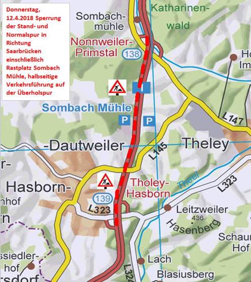 Am Donnerstag, den 12.4.2018, wird der Landesbetrieb für Straßenbau (LfS) im Vorfeld einer anstehenden grundhaften Erneuerung der A 1 – Richtungsfahrbahn Trier zwischen den Anschlussstellen (AS) Nonnweiler-Primstal (138) und Tholey-Hasborn (139) Fahrbahnschäden auf der Richtungsfahrbahn Saarbrücken beheben. Betroffen ist die Standspur auf einer Länge von rund 3500 Metern. Während der zweiwöchigen Bauzeit wird der Verkehr einstreifig auf der Überholspur am Baufeld vorbeigeführt. Parallel dazu werden auch Schadstellen auf dem Rastplatz Sombach Mühle behoben. Er muss aus diesem Grund gesperrt werden.
