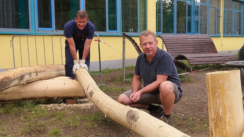 Als solche sind die durcheinander gepurzelten, geschälten Robinienstämme auf dem Schulhof der Gemeinschaftsschule Marpingen erstmal nicht zu erkennen. Und auch der zweite Blick zeigt, dass es hier nicht nur ums Spielen, ums Klettern oder Chillen geht: Die natürliche Wuchsform der entrindeten und gehobelten Stämme, miteinander in organischen Formen verschraubt, ergeben ein Gesamtkunstwerk, das von allen Schülerinnen und Schülern der Schule genutzt werden kann: Die einen versuchen sich im Balancieren, andere lehnen sich bequem an die sanften Rundungen der Stämme und für manche sind sie ein inspirierender Hingucker. So zufällig, wie es die Bezeichnung Baummikado nahelegt, ist aber die Zusammenstellung der Stämme keineswegs: Es gehört ein künstlerisches Auge dazu, um aus den massiven Holzstämmen ein organisches Ganzes zusammenzustellen. Und ohne handwerklichen Sachverstand geht es auch nicht, schließlich muss die Konstruktion auch sicher sein und vom TÜV abgenommen werden.