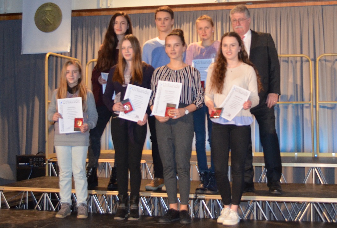 Im Anschluss an den Vortrag wurden die Cusanus – Medaillen überreicht. Diese gingen an die Jahrgangsbesten, sowie an die Tischtennismannschaft, die sich erneut für das Bundesfinale qualifizieren konnte und an die zahlreichen erfolgreichen Teilnehmer und Gewinner von außerschulischen Wettbewerbern, wie etwa der Mathematikolympiade, dem Vorlesewettbewerb oder dem Wortsegel Schreibwettbewerb der Gemeinde Tholey. Auch die zukünftigen Abiturienten, die sich jahrelang in AG’s wie zum Beispiel der Zeitungs-AG engagiert hatten, erhielten die Cusanus – Medaille.