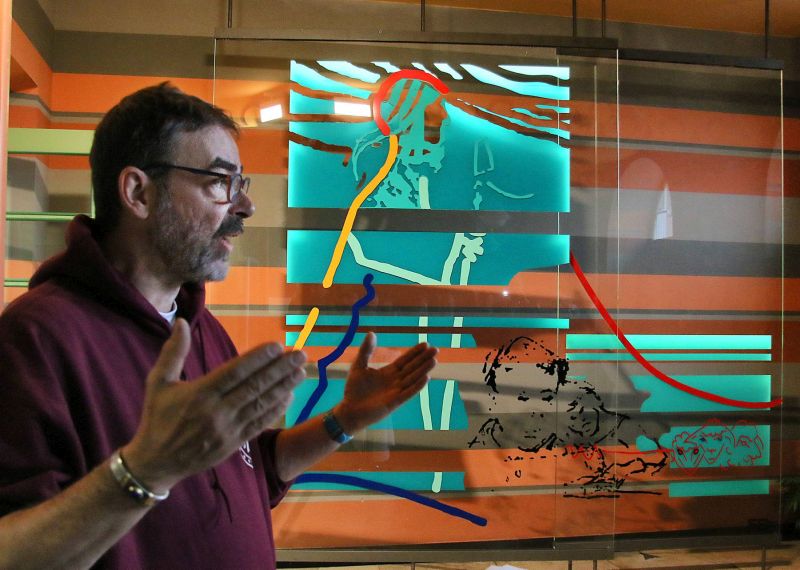 In unzähligen Stunden, über viele Monate hinweg hat der hauseigene Lehrer und Künstler letztlich den Entwurf erstellt, der auf den ersten Blick überrascht. Zwei monumentale sich überschneidende Glasplatten mit den Konturen eines Hirten darauf sind entstanden. Eine überlebensgroße Figur mit Hut und Stab, angedeutet durch blaugrüne Streifen, rote, gelbe und blaue Linien. Darunter die vermeintlichen Gesichter von Schülern skizziert. Frank Brenner will sich da nicht festlegen, er spielt mit Andeutungen. „Ein Kunstwerk muss dich bei deiner Seele packen, wenn es das nicht tut, dann ist es nicht für dich gemacht.“