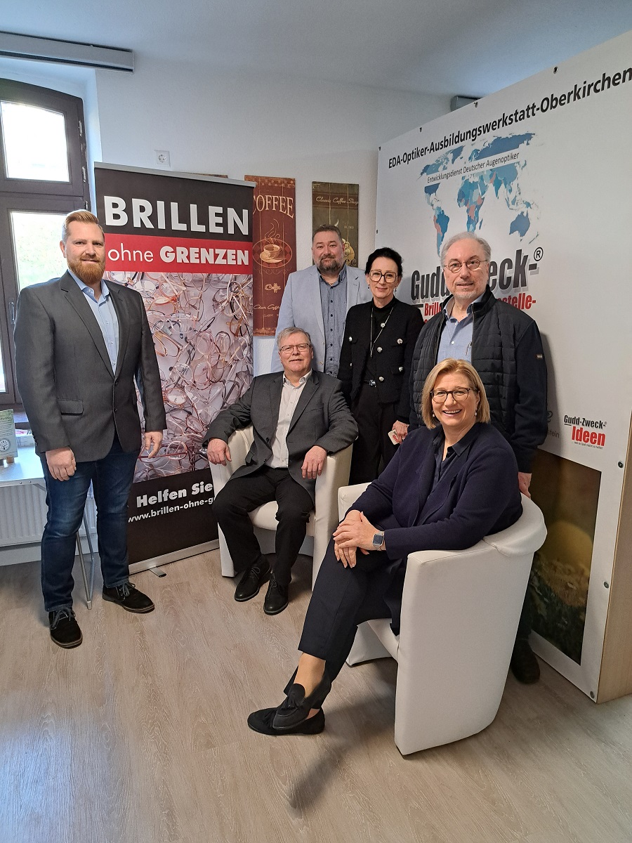 v.l.n.r.: Thorsten Schmidt (1.Beigeordneter der Gemeinde Freisen und stellv. Ortsvorsteher von Freisen), Karl-Josef Scheer (Bürgermeister der Gemeinde FREISEN – sitzend), Bernd Kreutz (Ortsvorsteher von Oberkirchen),  Michaela Roos (Gudd-Zweck UG &  www.BRILLEN-ohne-GRENZEN.de),  Anke Rehlinger (Ministerpräsidentin des Saarlandes – sitzend),  Gerald Linn (SPD-Verbandsvorsitzender und Ortsvorsteher von Eitzweiler)