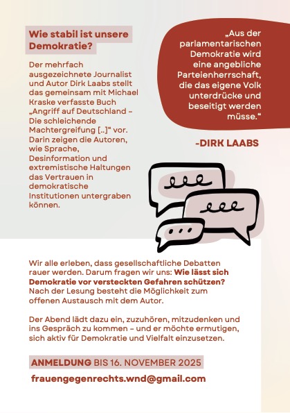 Laabs wird aus seinen jahrelangen Recherchen zu rechtsextremen Netzwerken berichten. Der Journalist zeigt auf, wie durch gezielten Einsatz von Sprache, Falschinformationen und systematischer Stimmungsmache das Vertrauen der Bürger in die demokratischen Strukturen untergraben wird.