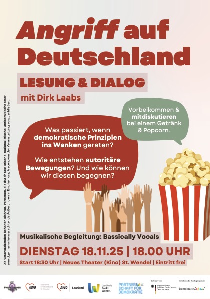 Am Dienstag, den 18. November 2025, findet im Kino Neues Theater St. Wendel eine kostenlose Lesung mit anschließender Diskussion statt. Der Journalist und Autor Dirk Laabs stellt ab 18:30 Uhr sein gemeinsam mit Michael Kraske verfasstes Buch „Angriff auf Deutschland – Die schleichende Machtergreifung“ vor.