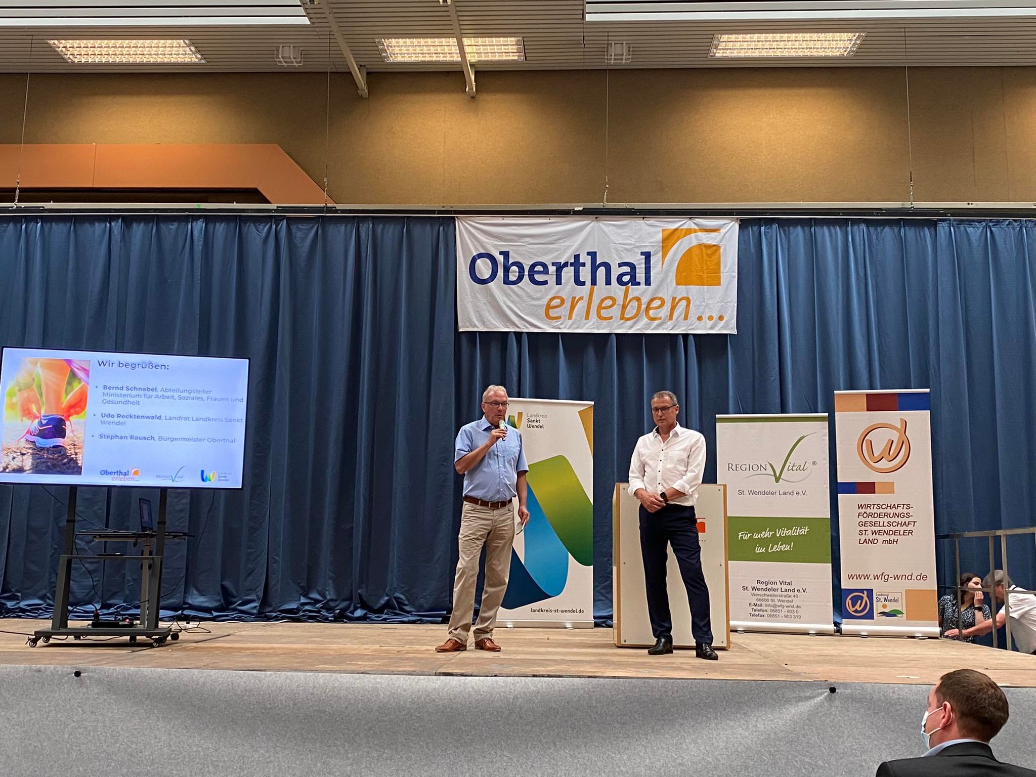 Die Pandemie habe uns klargemacht, wie wichtig Gesundheit für uns sei, sagte Landrat Udo Recktenwald in seiner Begrüßungsrede zu Beginn der Veranstaltung. Deshalb freue es sich, dass diese Veranstaltung wieder stattfinden könne. Dem stimmte auch Bürgermeister Stephan Rausch zu, der froh darüber war, dass die Gemeinde Oberthal dieses Jahr Gastgeber sein durfte. Da der Astronaut Matthias Maurer aus der Gemeinde stammt, wies er darauf hin, dass Gesundheit wichtig sei, „wenn man ins All will“, denn nicht nur seine Ausbildung habe ihn dahin gebracht, sondern auch seine körperliche Fitness. Er empfahl allen, sich Tipps für ihren Alltag mitzunehmen und diese umzusetzen.
