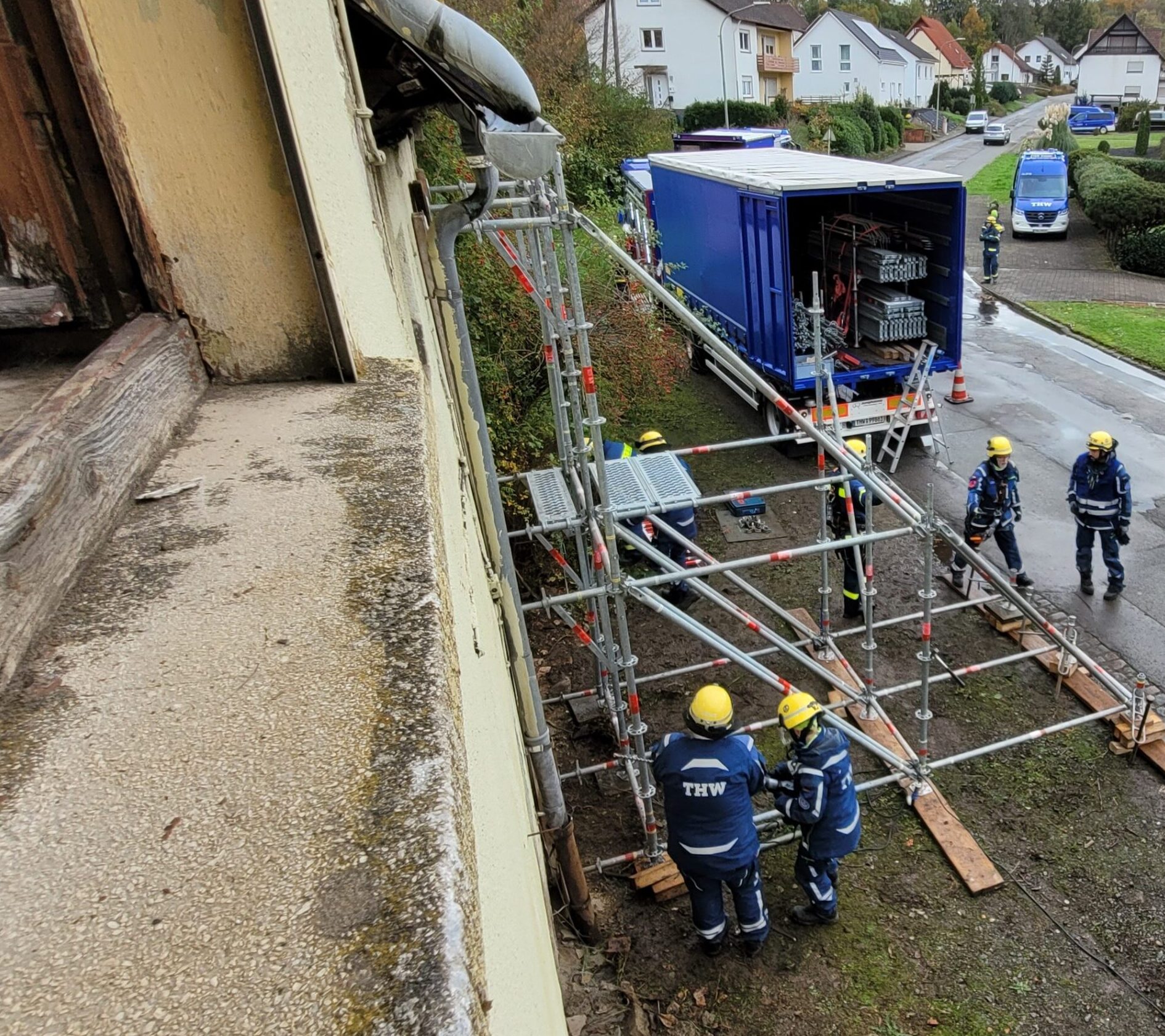 Das Übungsobjekt, bestehend aus einem Wohnhaus mit angebauter Scheune, wies erhebliche Schäden auf und drohte teilweise einzustürzen. Bevor die Helfer das Gebäude betreten konnten, mussten sie es zunächst absichern. An der Außenfassade bauten sie ein spezielles Stützsystem auf, das verhindert, dass instabile Wände nach außen wegbrechen. Im Inneren des Gebäudes sicherten sie weitere gefährdete Bereiche ab.