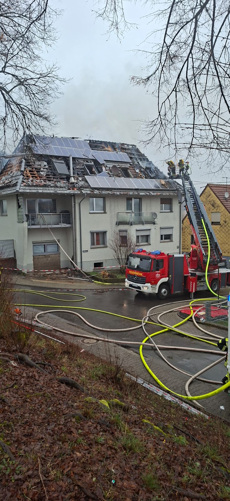 Der Notruf erreichte die Feuerwehr um 9.12 Uhr. Als die ersten Einsatzkräfte am Brandort eintrafen, loderten bereits Flammen aus dem Dachstuhl. Die Einsatzleitung forderte sofort zusätzliche Kräfte an. Zur Verstärkung rückten unter anderem eine zweite Drehleiter und ein Teleskopmastwagen der Bosch-Werksfeuerwehr aus Homburg an. „Wir haben parallel von innen und von außen gelöscht“, erklärte Feuerwehrsprecher Lukas Becker. Die Einsatzkräfte arbeiteten unter Atemschutz und mussten sich aufgrund der extremen Bedingungen regelmäßig ablösen lassen.