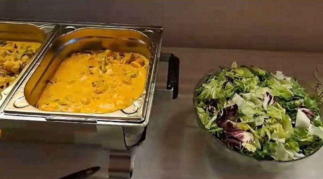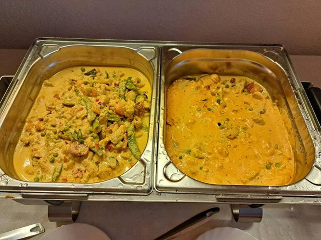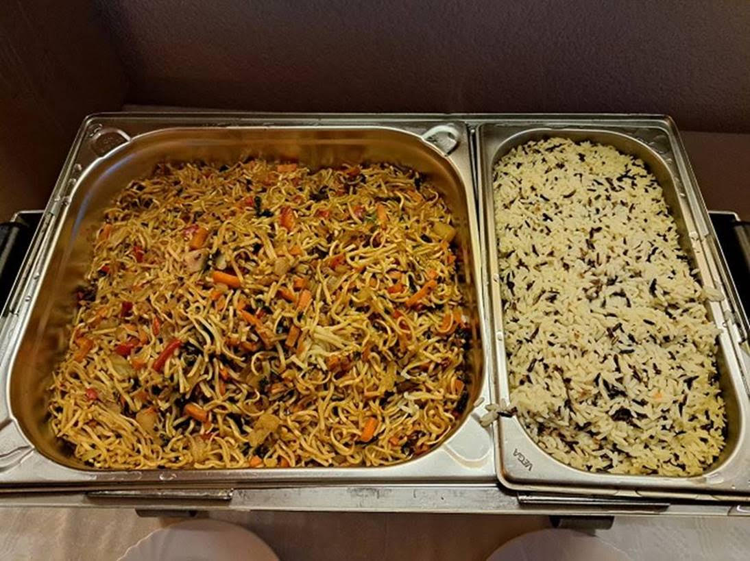 Leckeres ASIA-Putengeschnetzeltes nach eigenem Haus-Rezept von CATERER ARNDT SOMMER mit schmackhaften Dim-Sum-Nudeln und feinem Basmati-Reis, sowie gemischtem Salat.