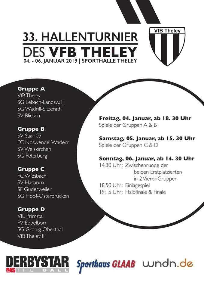 Theley. Bereits zum 33. Mal lädt der VfB Theley an diesem Wochenende zum Derbystar-Cup in die Sporthalle nach Theley. Wie auch in den Vorjahren ist es den Veranstaltern wieder gelungen, ein attraktives Teilnehmerfeld zusammenzustellen. 54 Masterspunkte werden auf der Veranstaltung an die bestenteilnehmenden Mannschaften verteilt. Topfavorit auf den Titel ist Oberligist FC Hertha Wiesbach, der momentan mit 74,60 Zählern auf Rang vier der Qualifikationstabelle zum Hallenmasters des Saarländischen Fußballverbandes rangiert. Doch auch Lokalmatador und Vorjahressieger VfL Primstal kann sich sowohl Chancen auf einen erneuten Gewinn, als auch auf eine Teilnahme beim Masters ausrechnen. Nach einer enttäuschenden Hinrunde in der Saarlandliga präsentieren sich die Primstaler in der Halle bislang stark und stehen in der Masterswertung auf Platz zehn. Hoffnungen auf eine Topplatzierung beim Derbystar-Cup können sich außerdem die beiden Saarlandligisten Eppelborn und Saar 05, sowie der Verbandsligazweite Hasborn machen, die in diesem Winter allesamt schon Masterspunkte sammeln konnten. Gastgeber VfB Theley hingegen wartet bisher noch auf seine erste Top-Vier-Platzierung in der Hallenrunde. Beim eigenen Turnier, bei dem sich die Schwarz-Weißen traditionell stark zeigten, scheint jedoch auch ein Vordringen ins Halbfinale möglich. Die Vorrunde des Derbystar-Cups wird am Freitag und Samstag in vier Gruppen ausgetragen, bevor am Sonntag die Zwischen- und Endrunde steigen.