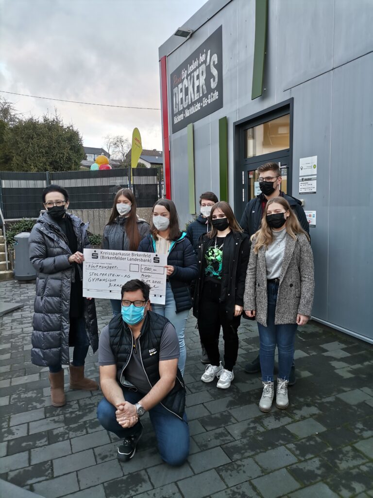 Bei der Übergabe der beiden Spendenschecks – pandemiebedingt vor dem Gebäude von EDEKA DECKER in Hoppstädten-Weiersbach – waren anwesend: Manuel Decker (EDEKA DECKER in Birkenfeld und Hoppstädten-Weiersbach), mehrere „mitmachende“ Schüler:innen der RWANDA AG und der STOLPERSTEIN AG des Gymansasiums Birkenfeld und Michaela Roos (Gudd-Zweck UG)