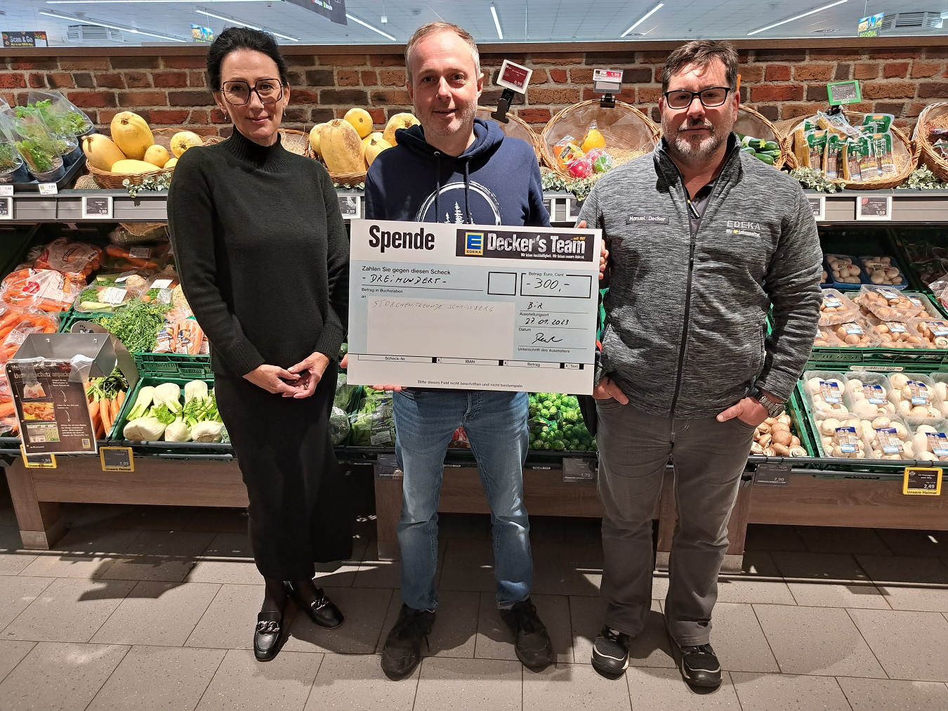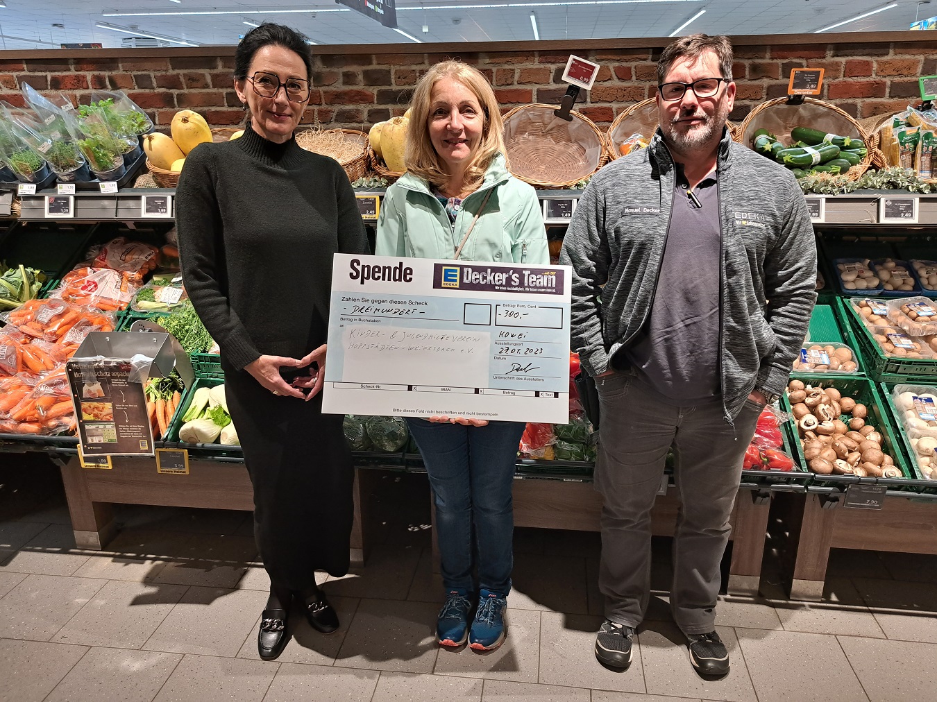 v.l.n.r.:  Michaela Roos (www.Gudd-Zweck.de & www.BRILLEN-ohne-GRENZEN.de), Frau Diana Heyda (Kinder- und Jugendhilfeverein Hoppstädten-Weiersbach), Manuel Decker (EDEKA DECKER in Birkenfeld und Hoppstädten-Weiersbach)