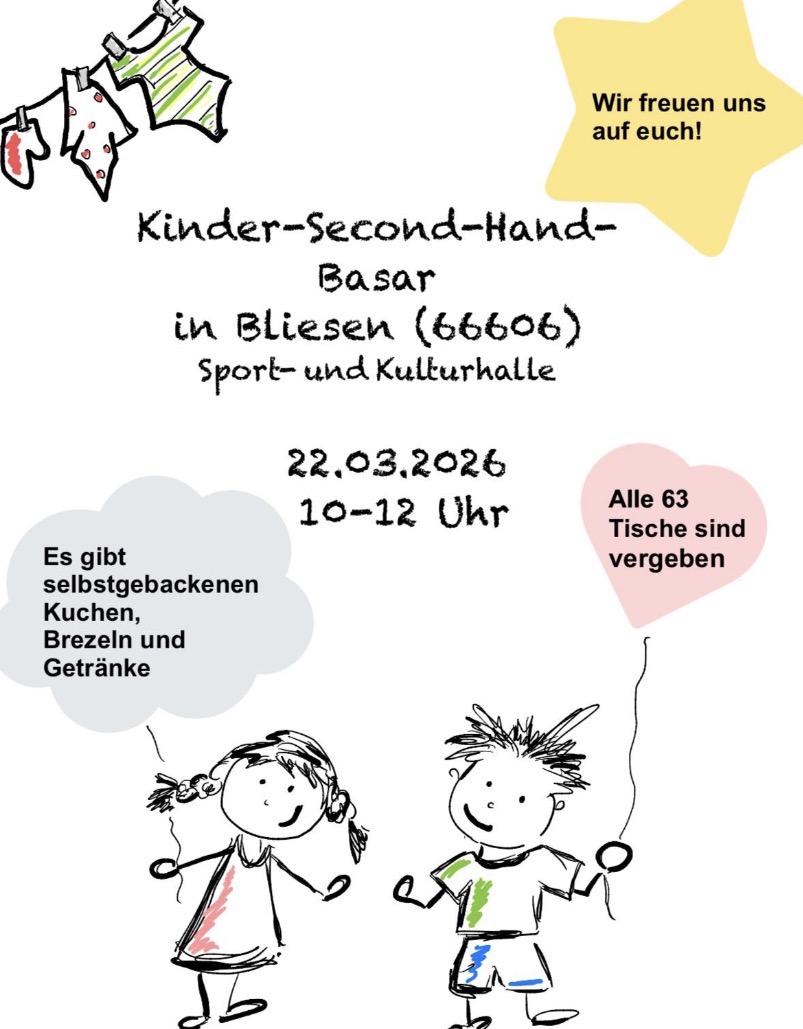 Die Sport- und Kulturhalle in Bliesen wird am Sonntag, dem 22. März 2026, zum Schauplatz eines Kinder-Second-Hand-Basars. Von 10 bis 12 Uhr lädt der Förderverein der katholischen Kindertagesstätte St. Remigius zu der Veranstaltung ein. Interessierte Besucher können sich auf ein breites Sortiment an gebrauchten Kinderartikeln freuen.