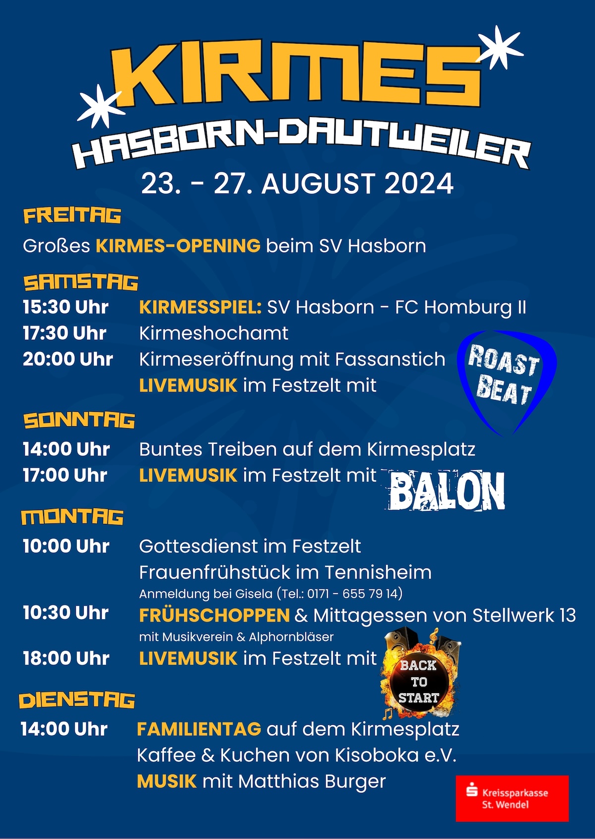 Der Auftakt erfolgt am Kirmesfreitag mit der traditionellen Kirmesparty im Waldstadion. Das Kirmesspiel der 1. Mannschaft des SV Rot-Weiß Hasborn findet in diesem Jahr am Samstag statt, weshalb vermutlich die 2. Mannschaft am Freitagabend spielt.