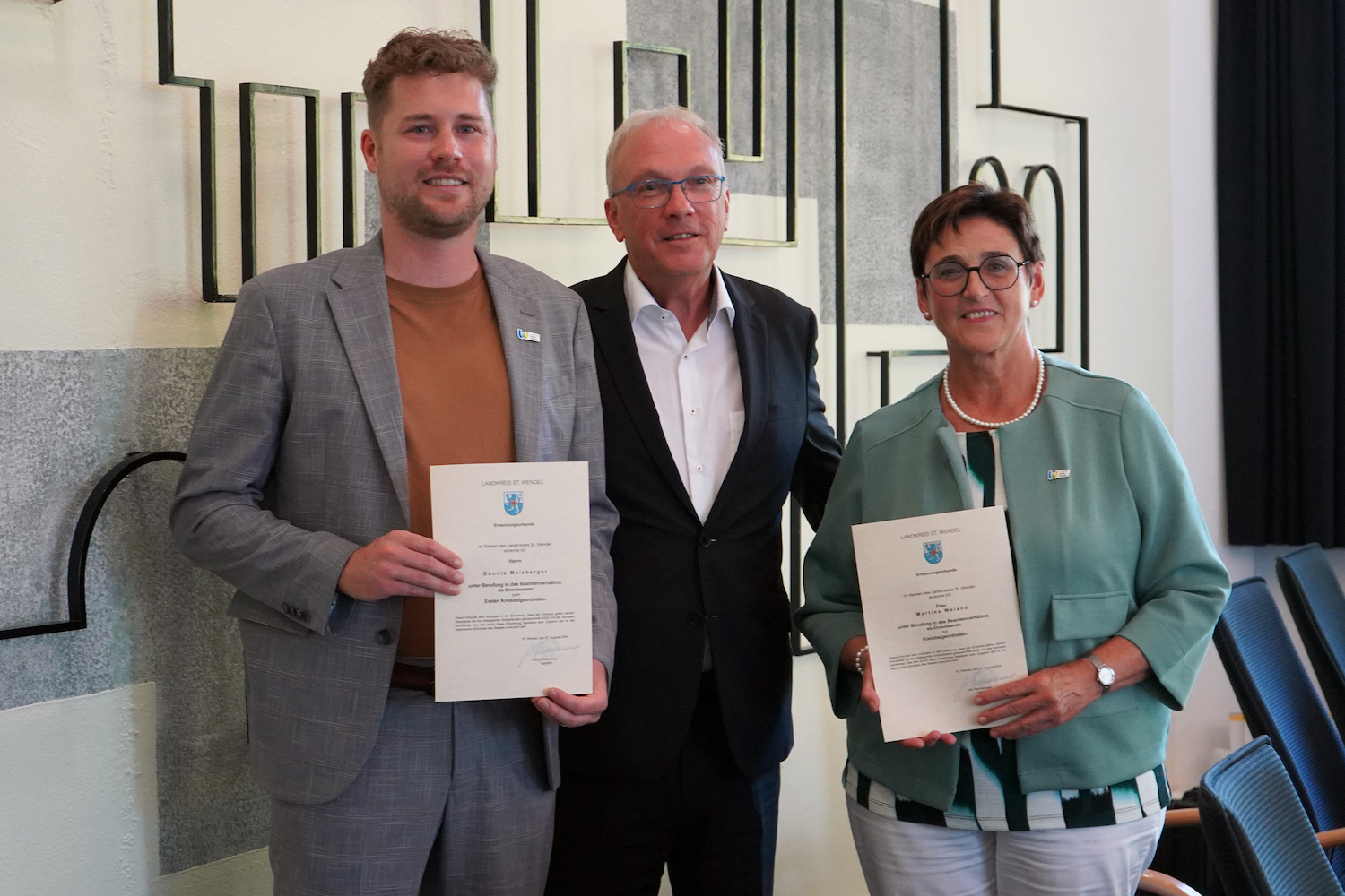 Die wiedergewählten Beigeordneten Dennis Meisberger (l.) und Martina Weiand (r.) haben von Landrat Udo Recktenwald ihre Ernennungsurkunden erhalten. (Foto: Lukas Kowol)