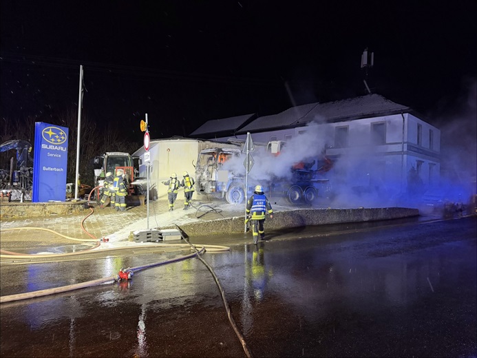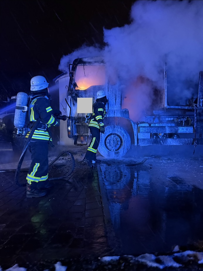 Die Feuerwehr begann sofort mit einem massiven Löschangriff und konnte die Flammen schnell unter Kontrolle bringen. Um ein erneutes Aufflammen zu verhindern, wurde der LKW im Anschluss großflächig mit Schaum bedeckt. Parallel erfolgte eine Kontrolle des Wohngebäudes auf Rauch- und Hitzeschäden.