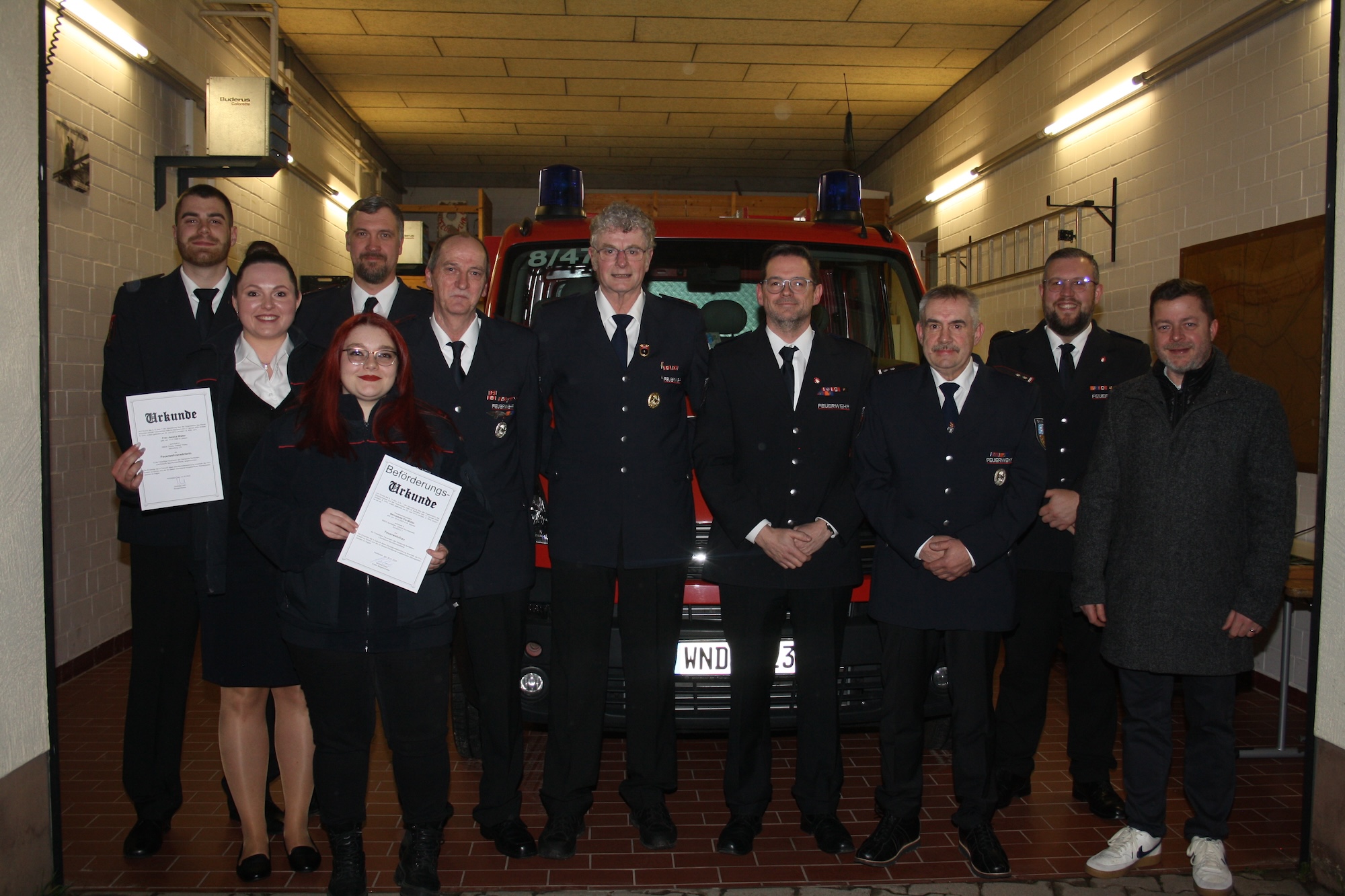 Der Erste Beigeordnete Michael Dietz würdigte während der Versammlung das langjährige Engagement von Michael Noster und Hermann Veit, die beide in die Altersabteilung wechseln. Diese umfasste zuvor nur ein Mitglied. Mit Jessica Walter konnte eine neue Feuerwehranwärterin gewonnen werden. Bernadette Müller wurde zur Feuerwehrfrau befördert, Keanu Therre zum Löschmeister und der stellvertretende Löschbezirksführer Stefan Jung zum Brandmeister. Jung erhielt zudem das Feuerwehr-Ehrenzeichen in Silber für 35 Jahre treue Dienste.