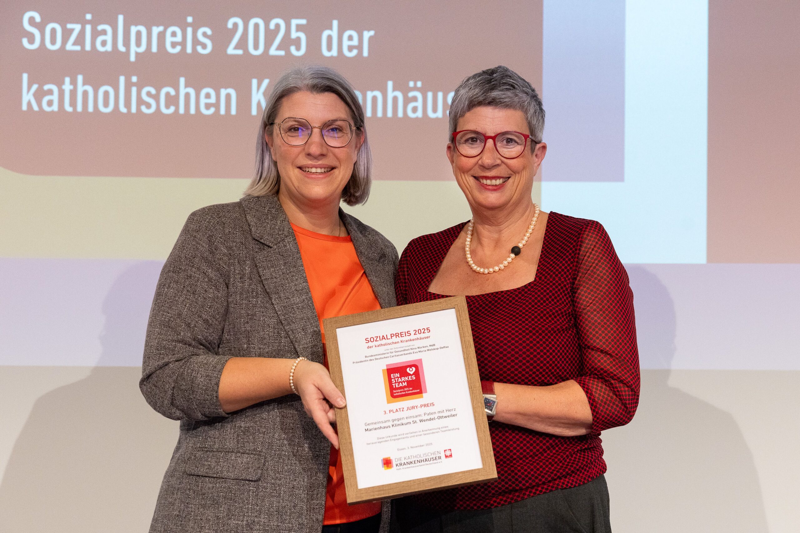Monika Krächen, die das Projekt koordiniert, und Nina Cullmann, Krankenhausoberin des Marienhaus Klinikums, nahmen die Ehrung persönlich entgegen. Die Bewertungskommission hob besonders den gesellschaftlichen Nutzen und die funktionierende Zusammenarbeit zwischen dem Krankenhaus und dem Landkreis St. Wendel hervor.