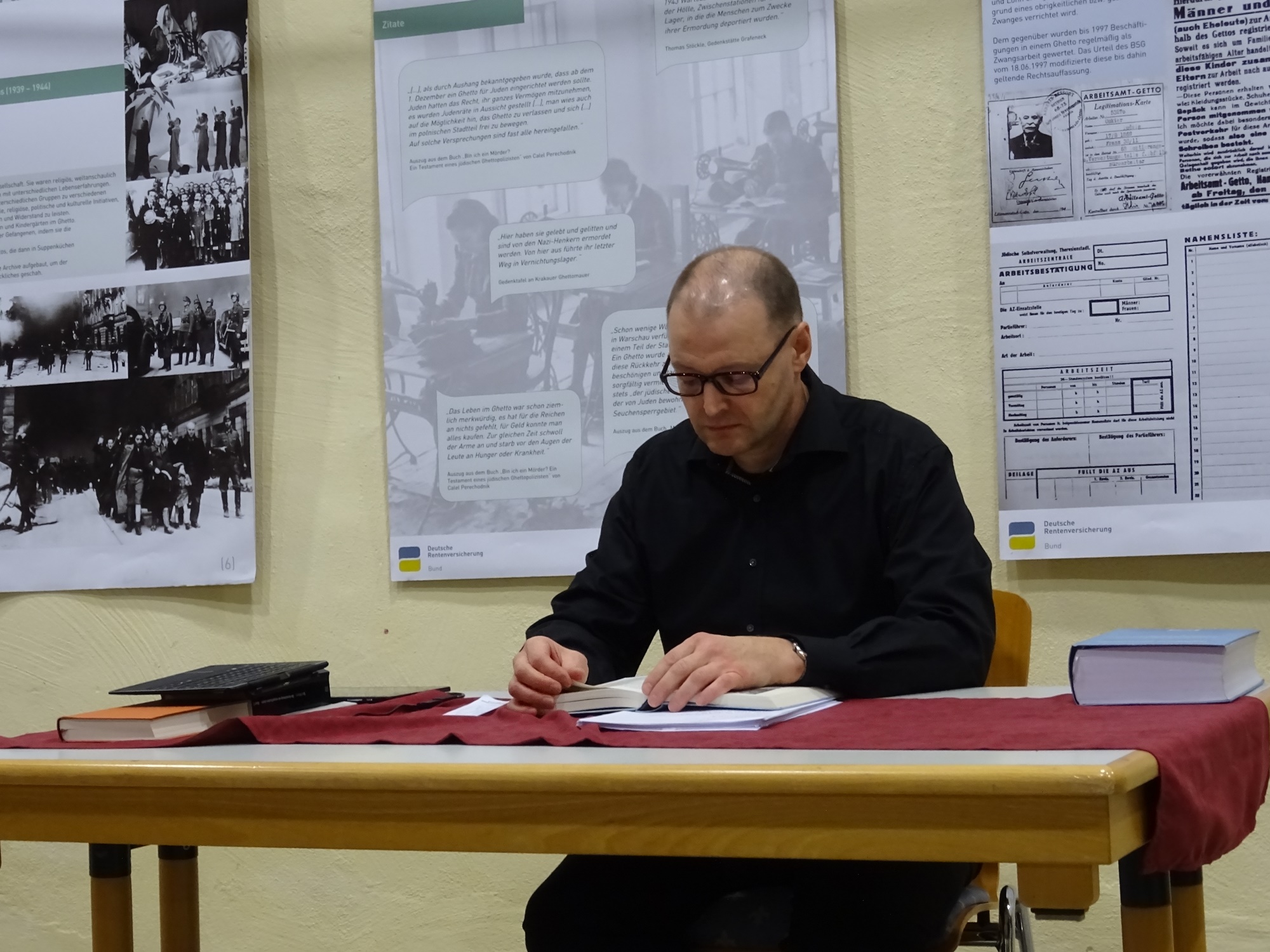 Als fachkundiger Referent der 8. „Marpinger Mühlengespräche, einer gemeinsam vom Verein und der Gemeinde Marpingen vor elf Jahren aus der Taufe gehobenen Veranstaltungsreihe, fungierte Christoph Zahn aus Marpingen, engagiertes Vorstandsmitglied des Vereins „Wider das Vergessen“ und zugleich Mitarbeiter der Deutschen Rentenversicherung Bund. Letztlich war es auch dieser doppelte Bezug zum Thema, der Zahn inspiriert und veranlasst hatte, die von seinem Arbeitgeber in Auftrag gegebene, von Auszubildenden der Deutschen Rentenversicherung in einer dreimonatigen, intensiven Projektarbeit erarbeitete und aus großen Text- und Bildplakaten bestehende Ausstellung nach Marpingen zu bringen und u.a. mit seinem beruflichen Fachwissen zu kommentieren.