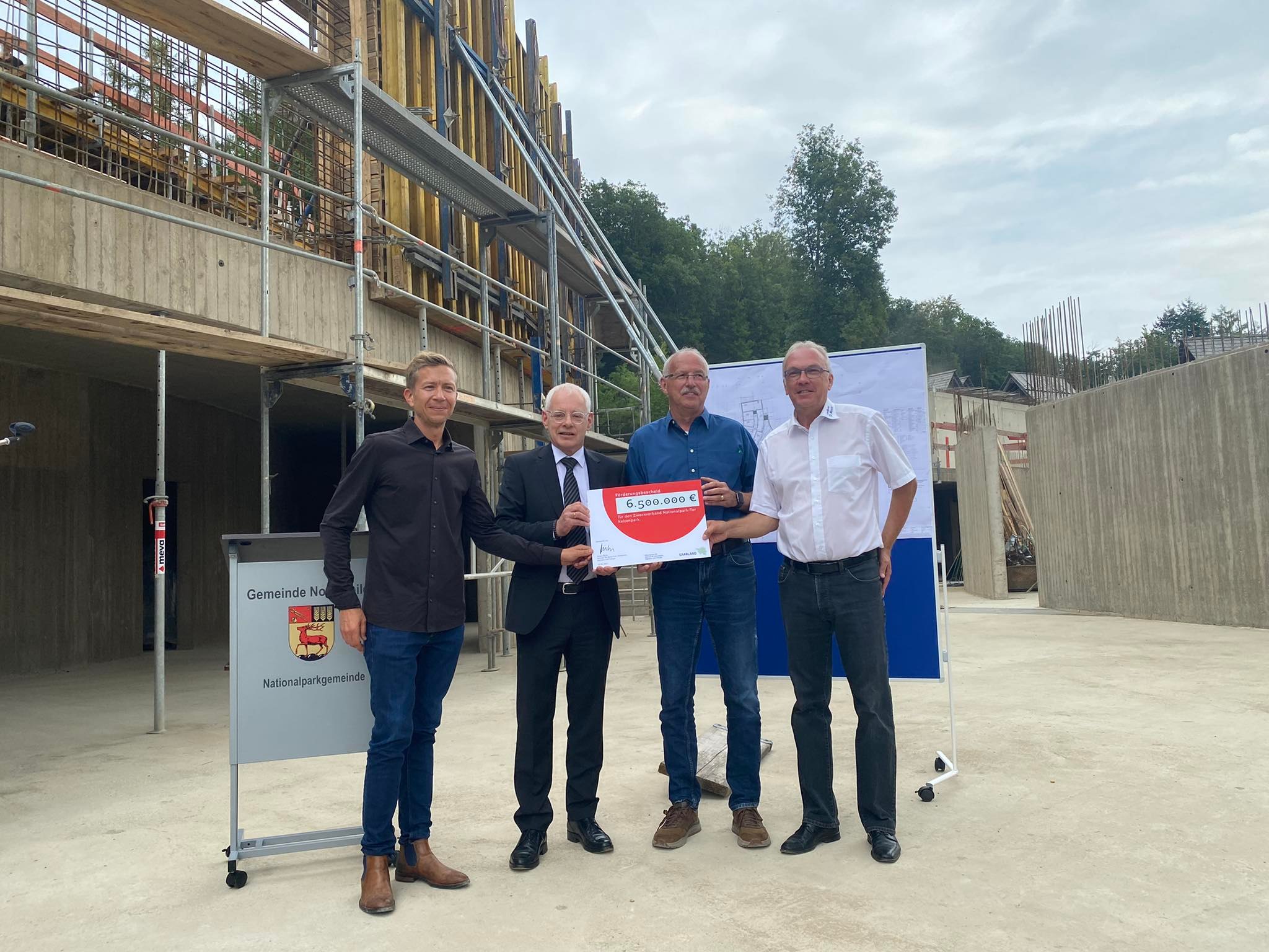Wirtschaftsminister Jürgen Barke hat sich am gestrigen Donnerstag, 18. August, gemeinsam mit Umweltstaatssekretär Sebastian Thul, dem St. Wendeler Landrat Udo Recktenwald und dem Nonnweiler Bürgermeister und Verbandsvorsteher Dr. Franz Josef Barth einen Überblick über den Baufortschritt des neuen Besucher- und Ausstellungszentrums Nationalpark-Tor Keltenpark verschafft. Im Gepäck hatte Barke einen Zuwendungsbescheid in einer Höhe, die den Bürgermeister nervös gemacht hat.