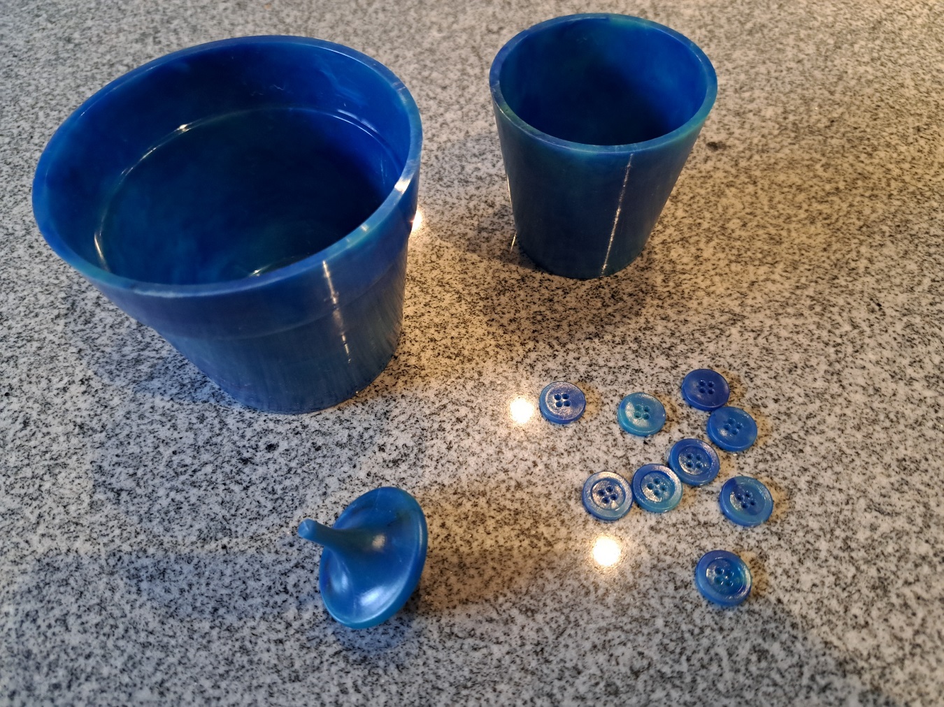 Z.B. können daraus kleine farbige Blumen-Töpfe oder auch farbige Knöpfe usw. produziert werden – je nach Vielfalt der benötigten Alu-Gußformen, die man für das Spritzgussverfahren braucht.