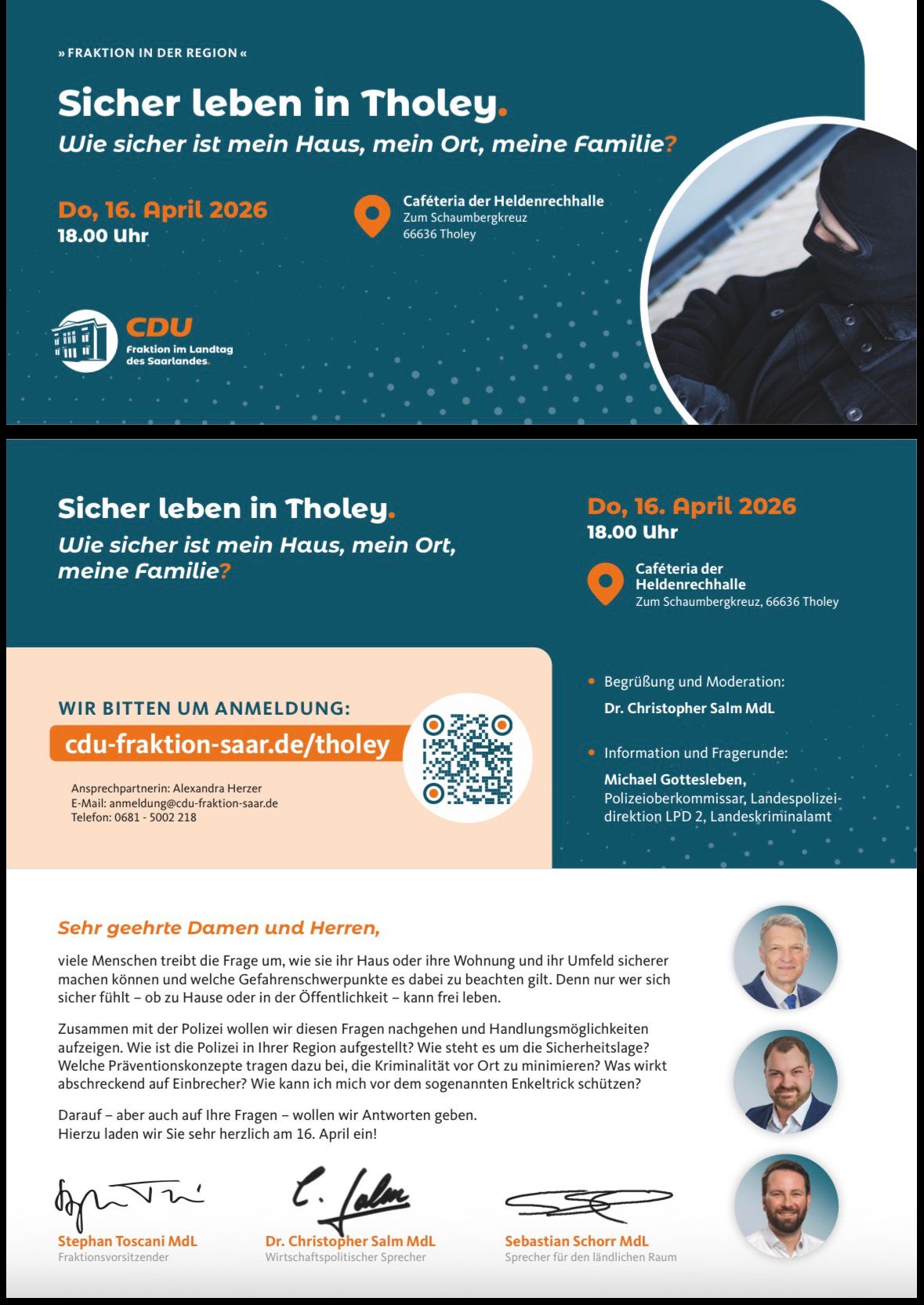 Die CDU-Fraktion im saarländischen Landtag veranstaltet am Donnerstag, 16. April 2026, um 18 Uhr eine Informationsveranstaltung zum Thema Sicherheit in der Caféteria der Heldenheckthalle in Tholey. Unter dem Titel „Sicher leben in Tholey. Wie sicher ist mein Haus, mein Ort, meine Familie?“ laden die Landtagsabgeordneten Stephan Toscani, Dr. Christopher Salm und Sebastian Schorr interessierte Bürger zum Dialog ein.