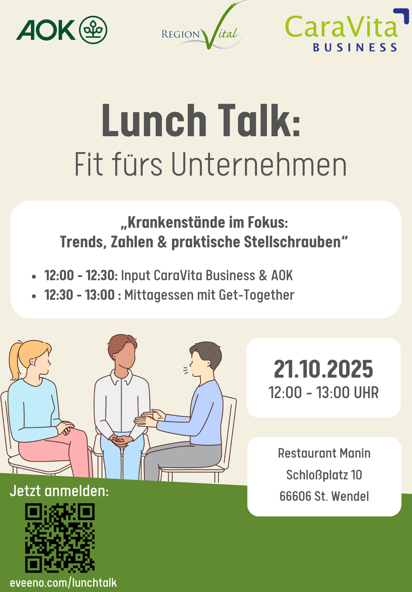 Am 21. Oktober 2025 veranstaltet der Verein Region Vital St. Wendeler Land einen Informationsaustausch zum Thema Krankenstände in Unternehmen. Die Veranstaltung findet von 12:00 bis 13:00 Uhr im Restaurant Manin in St. Wendel statt.