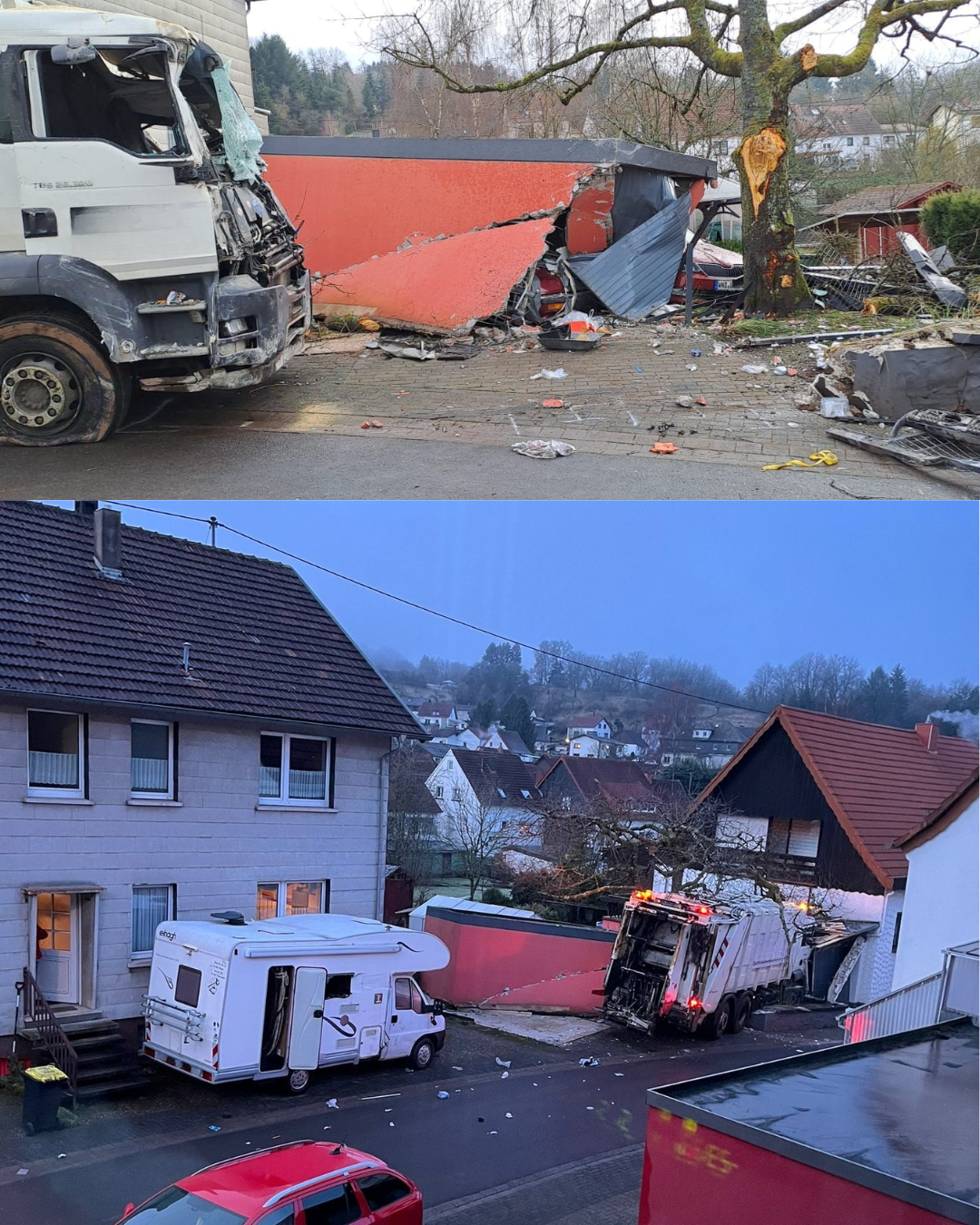 Gestern am frühen Morgen des 04.02.2026 rutschte gegen ca. 7:30 Uhr in Gehweiler im Hohlweg / der Eicherstbachstraße ein LKW der Müllabfuhr unbemannt den Berg hinunter und zerstörte mehrere Gebäude.