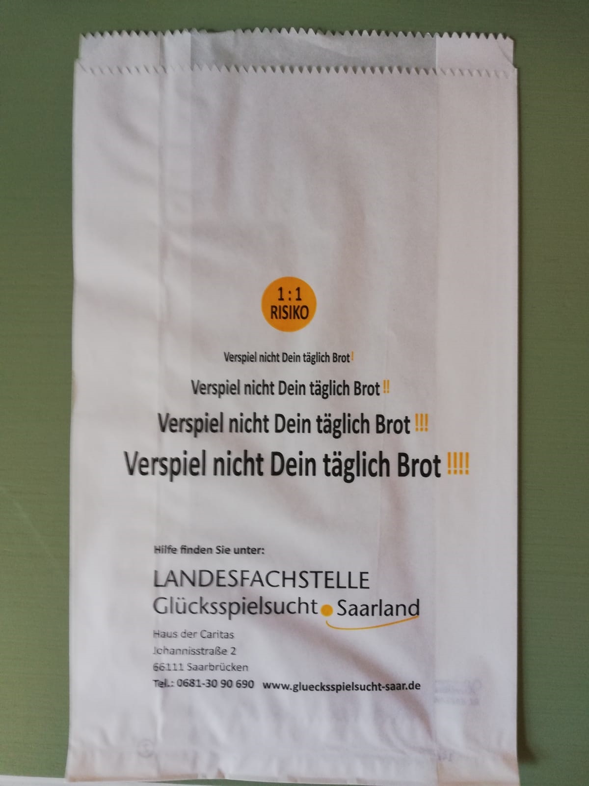 Landesweit machen auch „Bäckertüten“ mit der Aufschrift „verspiel nicht dein täglich Brot“ und den Kontaktdaten der Landesfachstelle auf die Problematik der Glückspielsucht aufmerksam. Im Landkreis St. Wendel beteiligen sich an dieser Aktion die Firma Fresenius, die St. Wendeler Tafel und die Landkreiskantine.