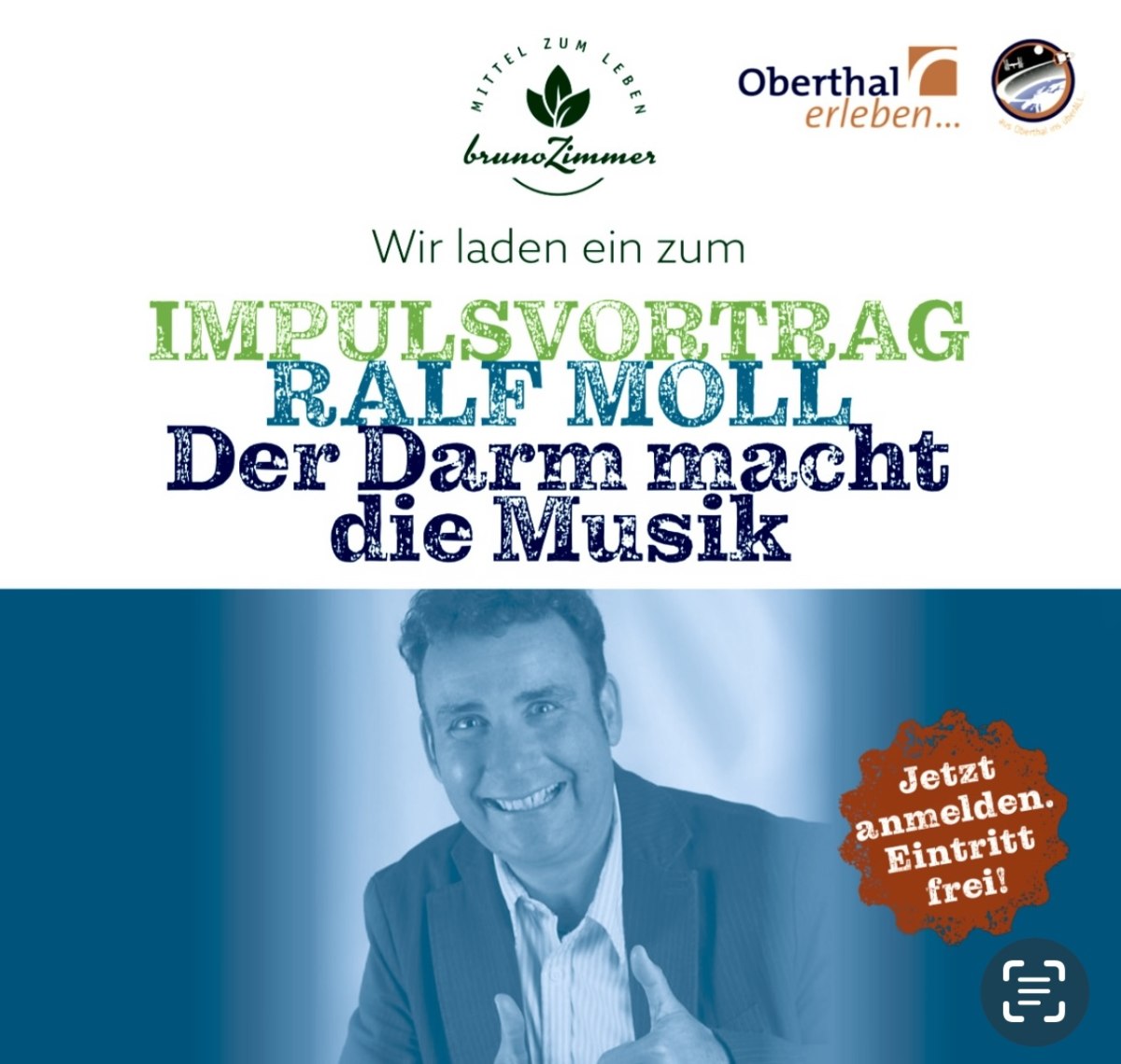 Im Rahmen der Gesundheitsprävention laden die Ölmühle Zimmer und die Gemeinde Oberthal am 13.11.23 um 18:00 Uhr zum Impulsvortrag „Der Darm macht die Musik“ des