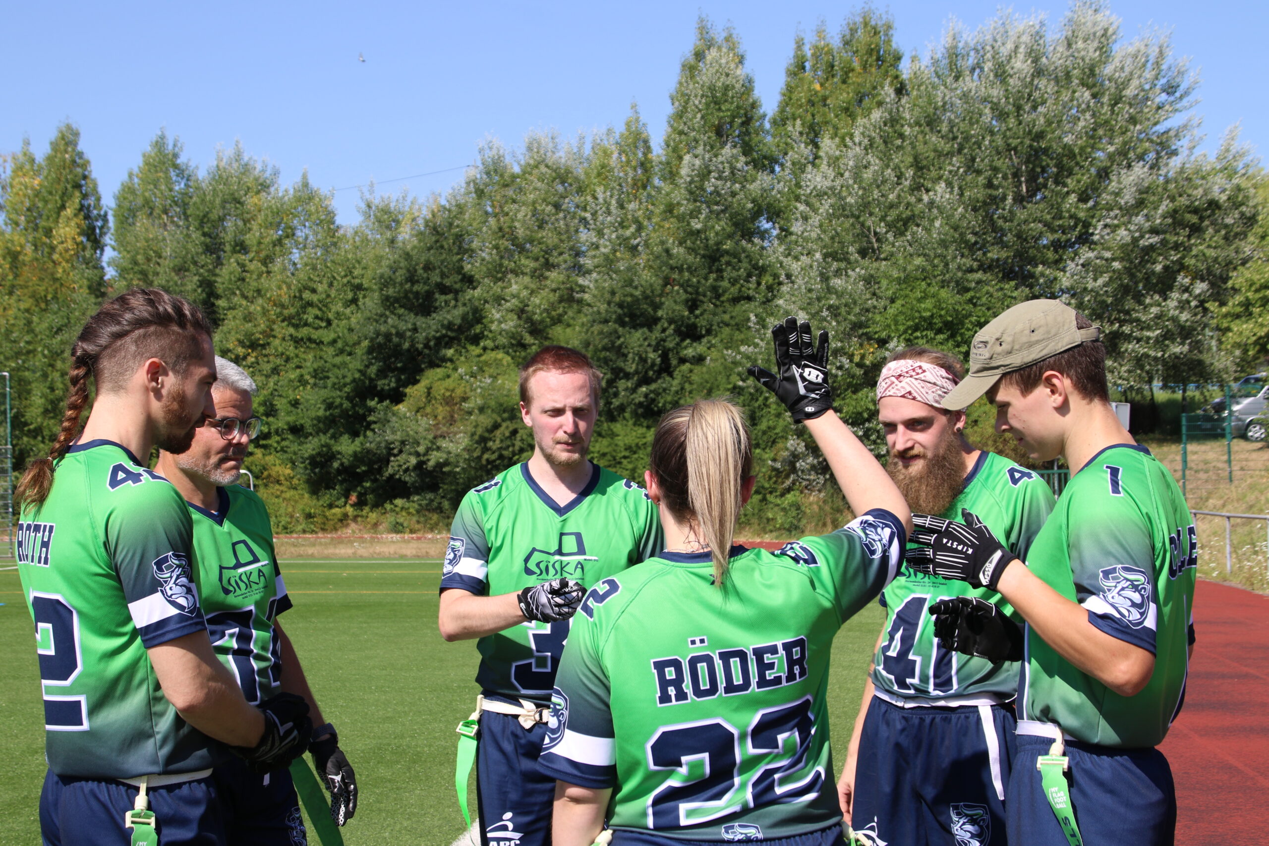 Die Randsportart hat somit ein sehr viel geringeres Verletzungsrisiko und ist perfekt für Neueinsteiger jeden Alters geeignet. „Unsere Spieler sind zwischen 16 und fast 50 Jahre alt“, erzählt Thorsten Dewes, der das Team trainiert und als Spieler aktiv ist. Eine Besonderheit am Flag Football ist außerdem, dass Frauen und Männer zusammen in einem Team spielen können. „Ich habe vorher gar keinen Sport in die Richtung gemacht und fühle mich hier total wohl und es macht einfach Spaß“, erzählt Viktoria begeistert. Sie ist bisher die einzige Frau im Team, hofft aber, dass sich noch mehr Frauen für die Sportart begeistern lassen.