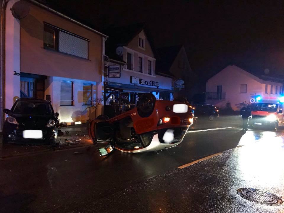 Im Anschluß des Zusammenpralles überschlug sich der Opel und kam auf dem Kopf liegend auf der Fahrbahn zum Stillstand.